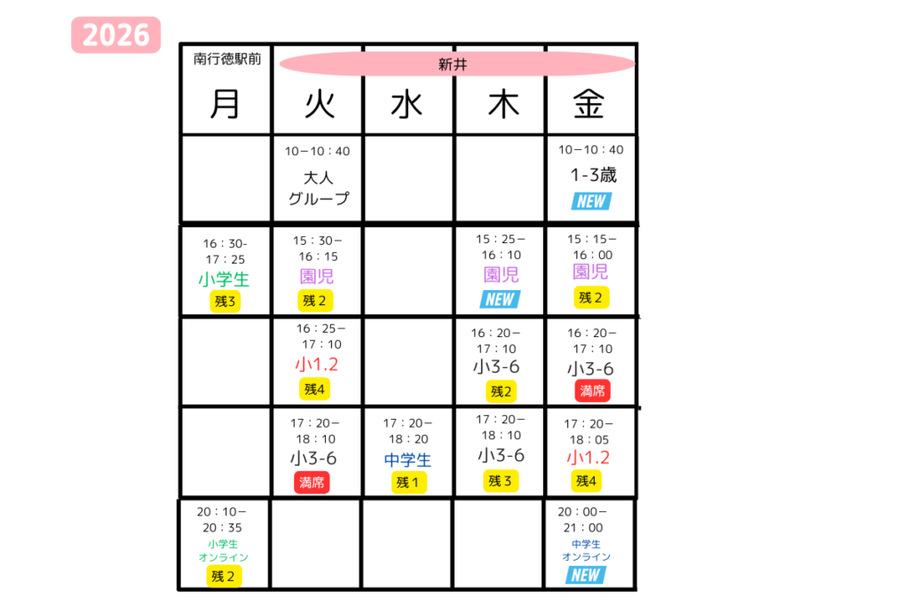 Rabbit(親子1~3歳)クラスは他の曜日も増設を検討していますので、ご相談ください。2026年度の小学生クラスは満席後の増設はありません。2~5月は変動が大きいため、日々変化しますので詳細はお問い合わせください。大人向けプライベート・グループレッスンも平日午前中に行っています。
